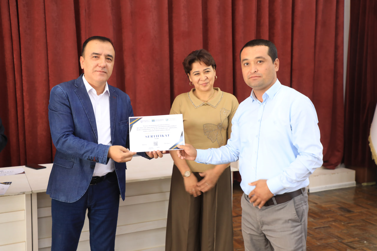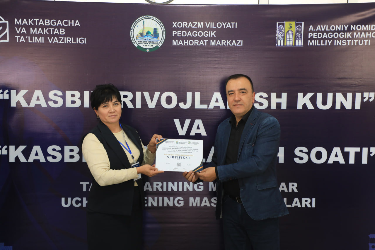 ✅Tadbir yakunida mentor-o‘qituvchilarga sertifikatlarni markaz direktori Salayev Jasurbek Komilovich hamda Xorazm viloyati maktabgacha va maktab ta'limi boshqarmasi ma'sul xodimi Go'zalxon Jumanovalar tantanali ravishda topshirishdi. Markaz direktori J.K.Salayev o‘z nutqida ishtirokchilarga kelgusi faoliyatlarida yuksak muvaffaqiyatlar va samarali natijalar tiladi.