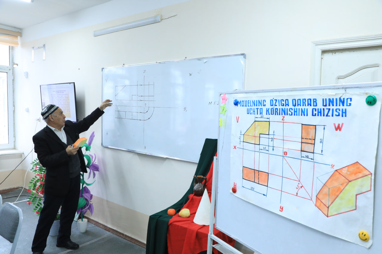 Jumladan, Karimov Farhod ustoz “Modelning o‘ziga qarab uning uchta ko‘rinishini chizish” mavzusida amaliy mashg‘ulot o‘tkazib, modellarni tahlil qilish, asosiy ko‘rinishlarini aniqlash hamda ularni chizmachilik qoidalariga muvofiq to‘g‘ri tasvirlash bo‘yicha batafsil tushunchalar berdi. Mashg‘ulot davomida tinglovchilar bilan birgalikda amaliy misollar yechildi va chizmalar ustida ishlash ko‘nikmalari mustahkamlandi.